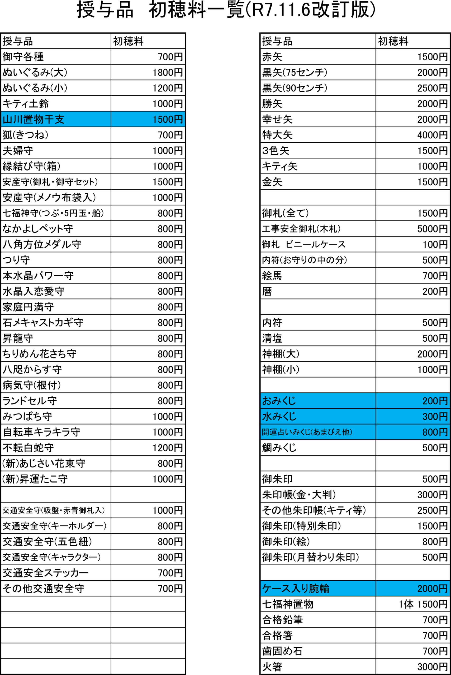 11月6日(木)より11月1日更新分より追加で授与品の初穂料の改定を行います。