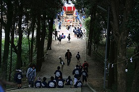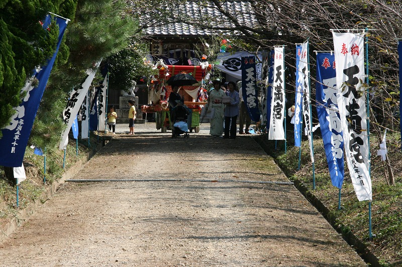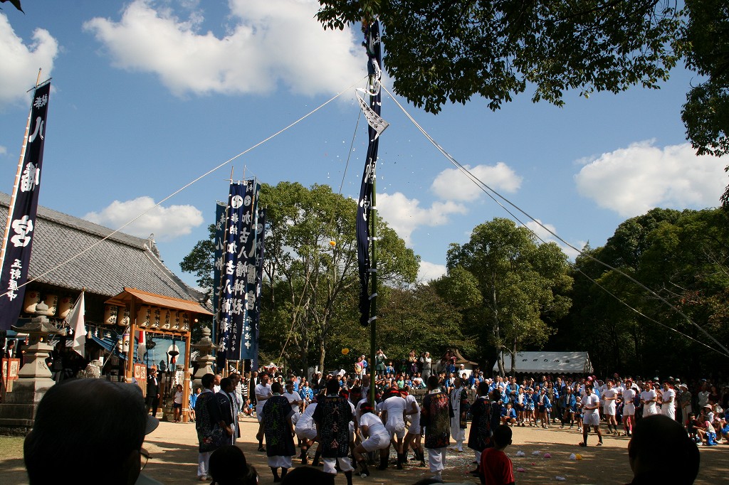 | コメント | 屋台1台が本殿前の長い石段を担いで上がり下がりするのが見ものである。神幸式も斉行される。春には桜の名所となり、大勢の花見客でにぎわう。 |
